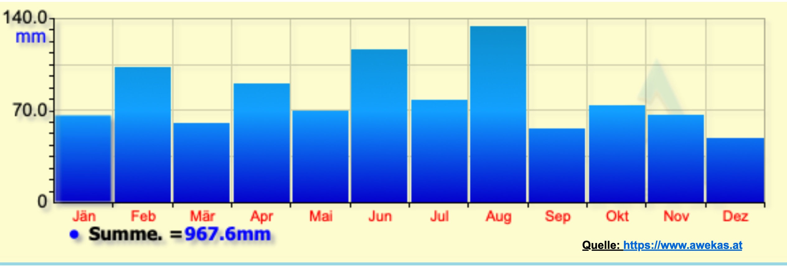 Das Jahr 2024 war mit insgesamt 967,6mm etwas zu feucht (+84mm). Zu nass waren v.a. die Monate Februar (103,6mm/ +51,5mm), April (91,0mm/ +36,9mm), Juni (116,4mm/ +38,5mm) sowie der August (135,2mm/ +61,3mm). Zu trocken waren der Juli (47,0mm/ -5,7mm), der September (58,2mm/ -5,8mm) und der Dezember (50,6mm/ -20,5mm).