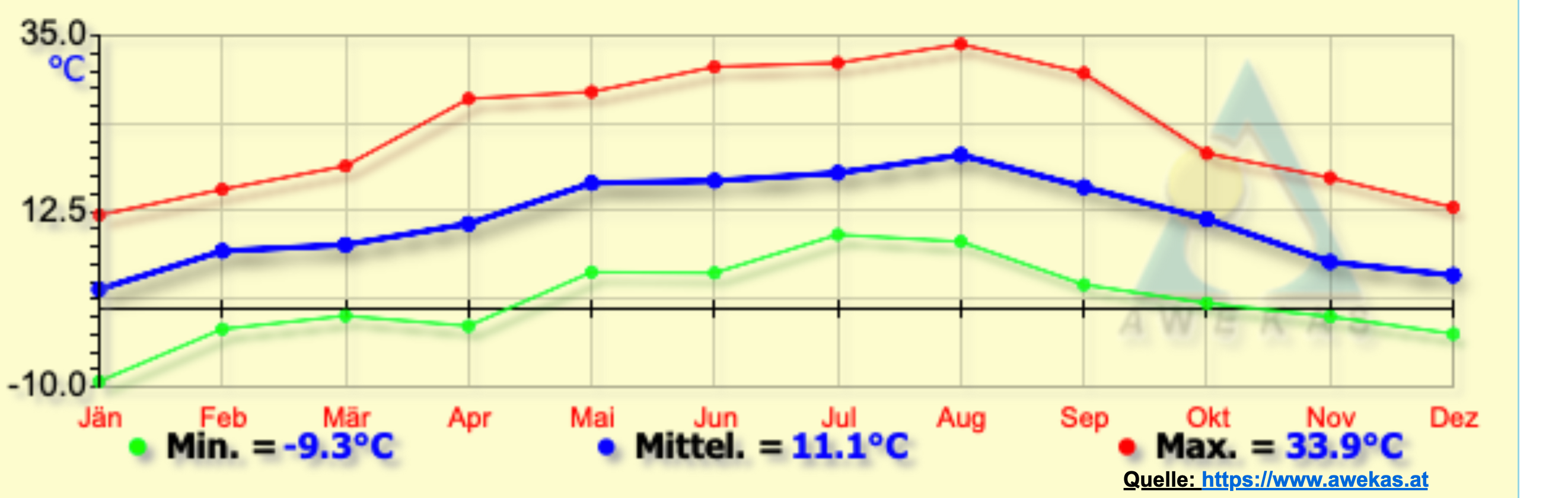 Am 11.01.2024 wurde mit -9,3°C die niedrigste Temperatur des Jahres registriert. Die Höchsttemperatur des Jahres 2024 konnte am 13.08.2024 mit 33,9°C gemessen werden. Aber selbst im September wurden noch hochsommerliche Temperaturen von knapp über 30°C (05.09.2024) erreicht.